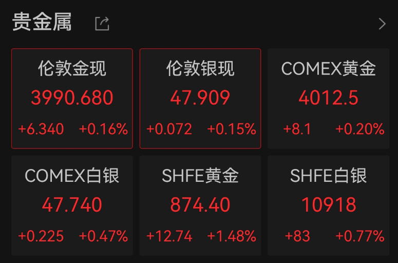 黄金成为盘中亮点。截至当地时间10月7日收盘,COMEX黄金期货价格收报4007.9美元/盎司,创收盘价历史新高;伦敦金现货价格一度触及3991.07美元/盎司。10月8日,国际金价继续走强,截至北京时间7:30,COMEX黄金期货盘中最高触及4015美元/盎司。