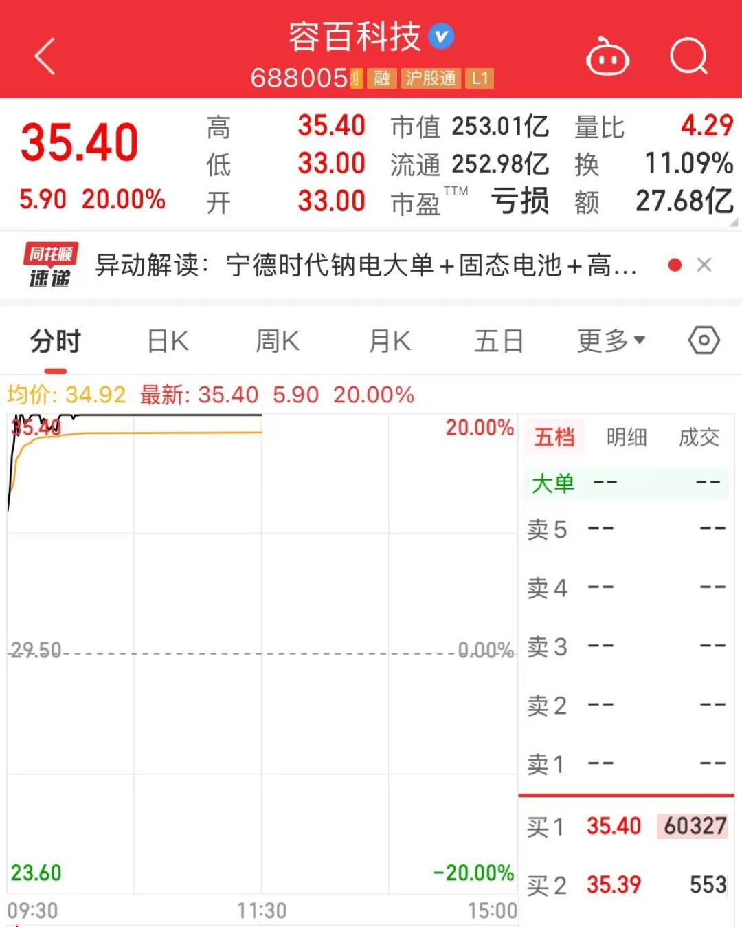 今天上午,容百科技集合竞价大幅高开,随后直线拉升,9:33左右,股价触及“20CM”涨停。