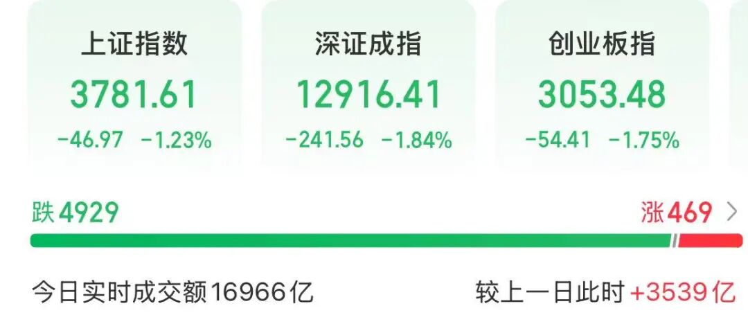 上午收盘,上证指数下跌1.23%,深证成指下跌1.84%,创业板指下跌1.75%。市场逾4900只个股下跌,成交额为16966亿元,较昨天上午增加3539亿元。
