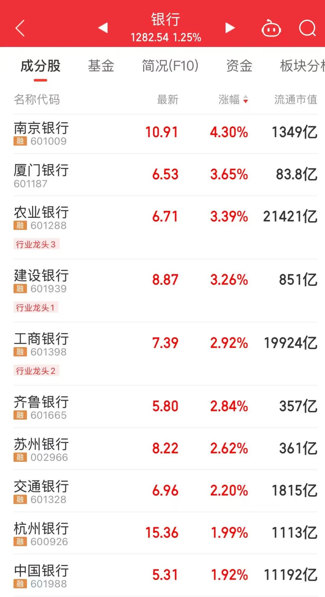 今天上午,银行板块迎来反弹,四大行农业银行、工商银行、建设银行、中国银行集体上涨,南京银行、厦门银行等个股涨幅居前。