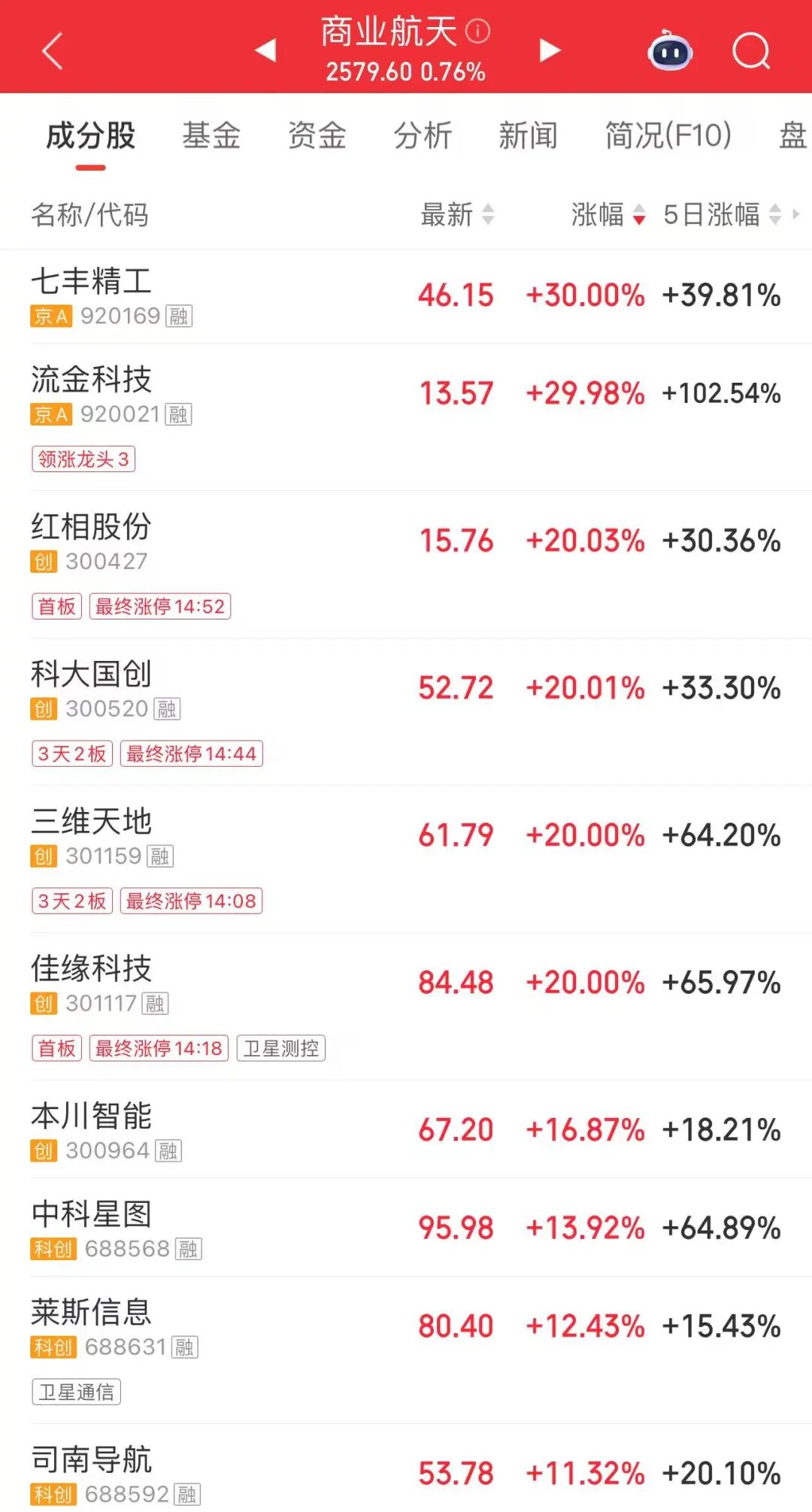 今日,商业航天概念股继续活跃,七丰精工、流金科技、三维天地、中科星图等大涨。