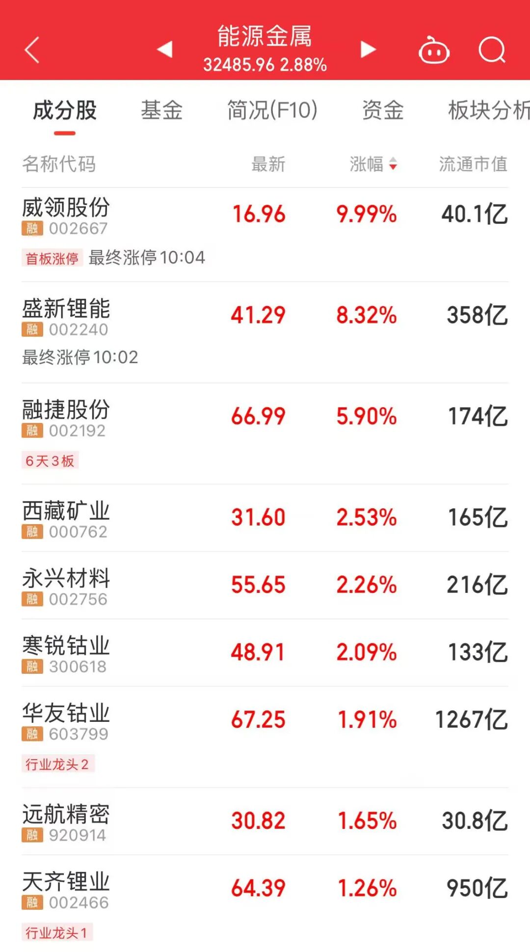 今天上午,锂电产业链表现活跃,能源金属、盐湖提锂等板块大涨。威领股份涨停,盛新锂能、融捷股份等个股涨幅居前。