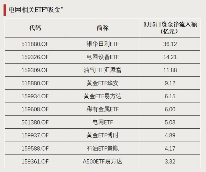3月5日,资金净流入额居前的ETF中还出现了油气、黄金、有色等相关ETF。