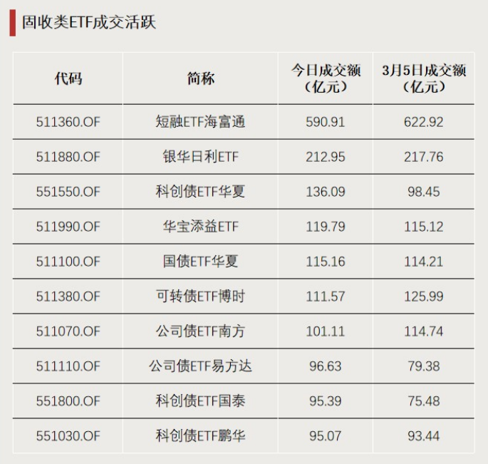 3月6日,固收类ETF成交活跃,多只可转债、国债、公司债、科创债相关ETF成交额突破100亿元。