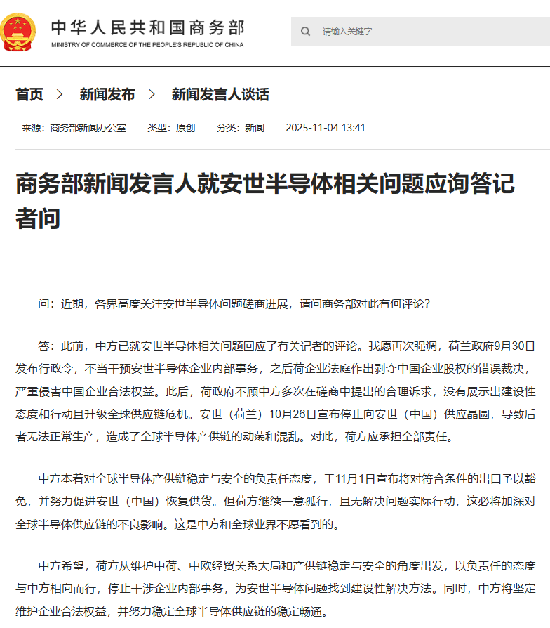 中方希望,荷方从维护中荷、中欧经贸关系大局和产供链稳定与安全的角度出发,以负责任的态度与中方相向而行,停止干涉企业内部事务,为安世半导体问题找到建设性解决方法。同时,中方将坚定维护企业合法权益,并努力稳定全球半导体供应链的稳定畅通。