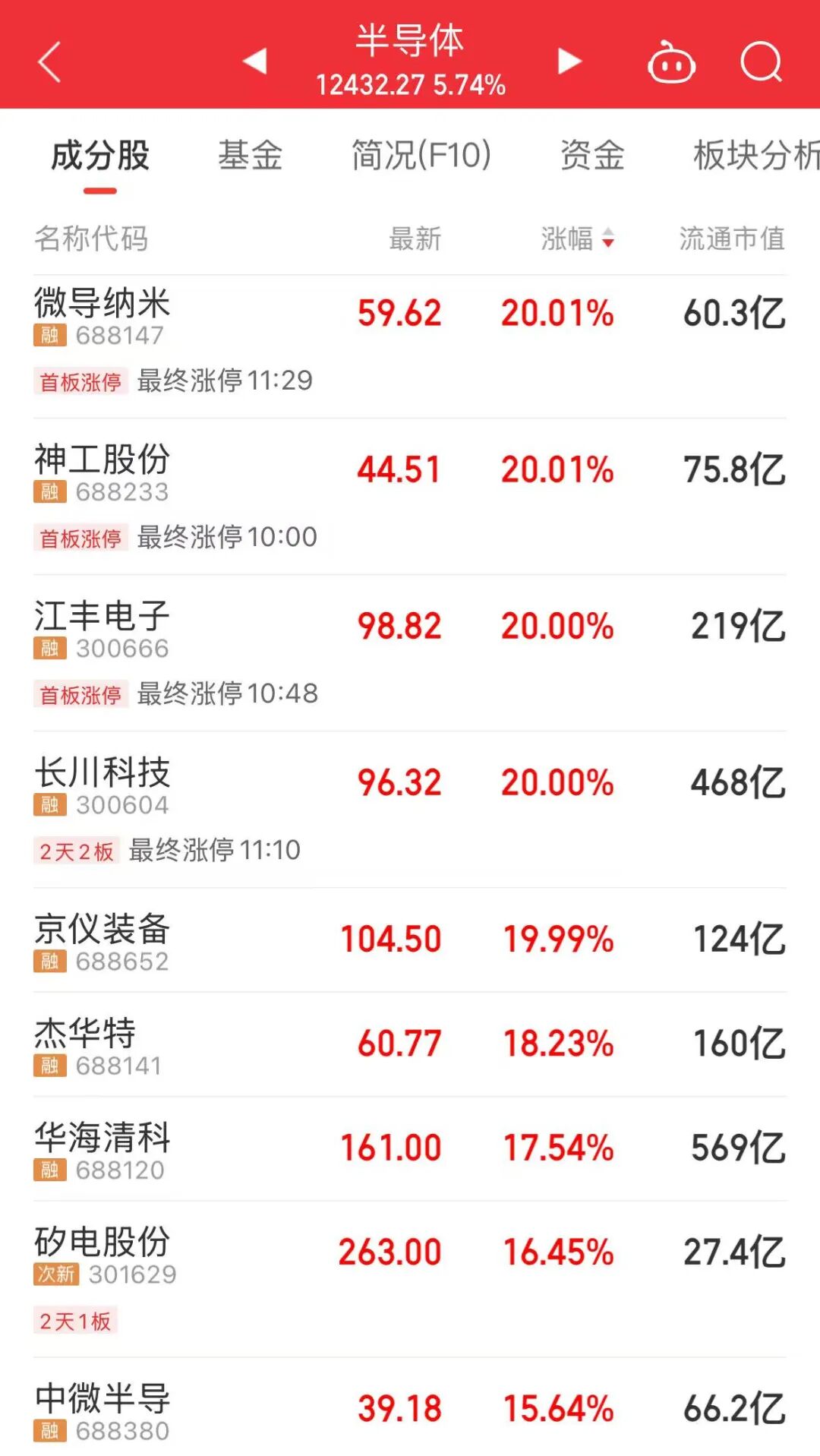 半导体设备板块中,昨日“20CM”涨停的长川科技,今天上午再度涨停。中微公司、拓荆科技、北方华创等龙头股也大涨。