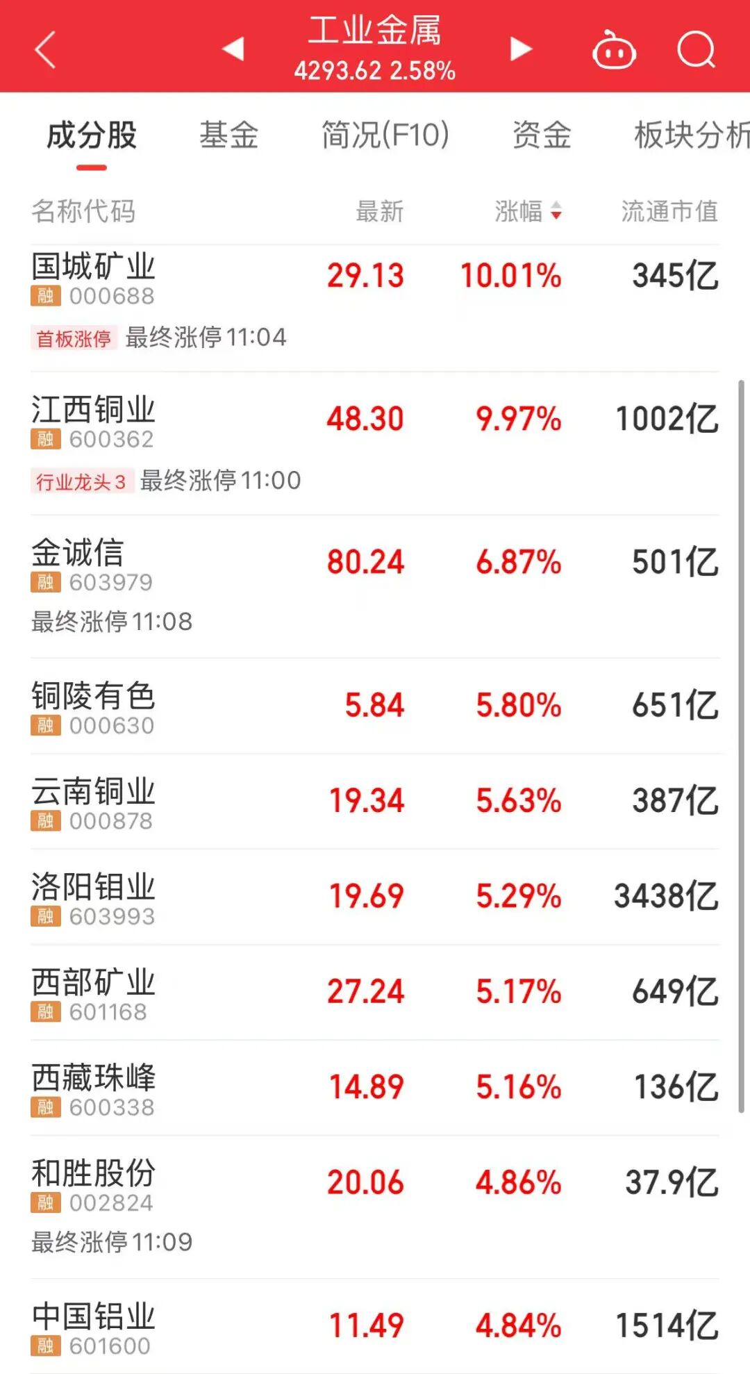 今天上午,有色金属板块上涨,贵金属、工业金属等板块上涨。