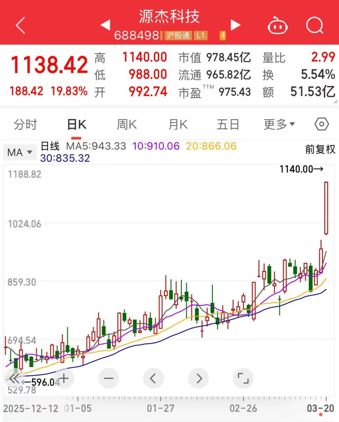 今天上午,源杰科技盘中一度“20CM”涨停,截至上午收盘涨19.83%,股价为1138.42元,跻身千元股行列,并超越寒武纪,成为A股第二高价股。该股从2025年4月9日上涨以来至今,累计涨幅超1100%。