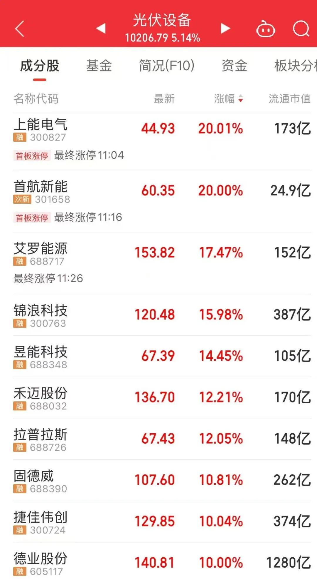 今天上午,光伏设备板块大涨,上能电气、首航新能、艾罗能源等个股大涨。
