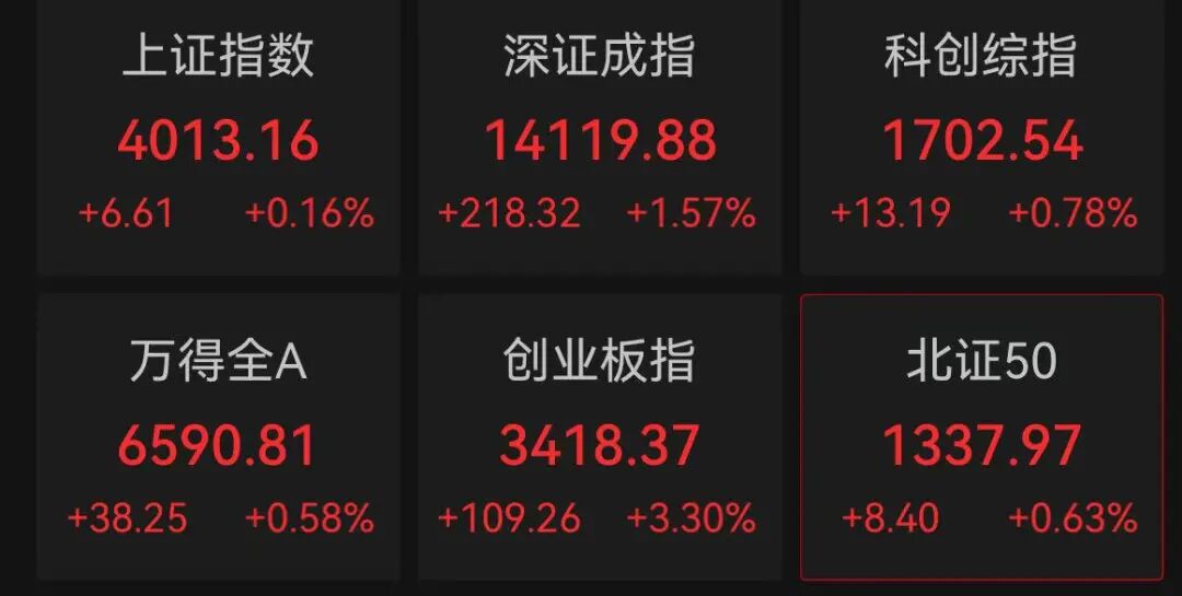 截至上午收盘,上证指数上涨0.16%,深证成指上涨1.57%,创业板指上涨3.3%,科创综指上涨0.78%。