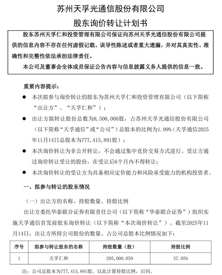 公告称,此次询价转让股份的数量为850万股,占天孚通信总股本的比例为1.09%,转让原因为自身资金需求。截至公告发布日,天孚仁和持有天孚通信股份2.95亿股,持股比例为37.95%。
