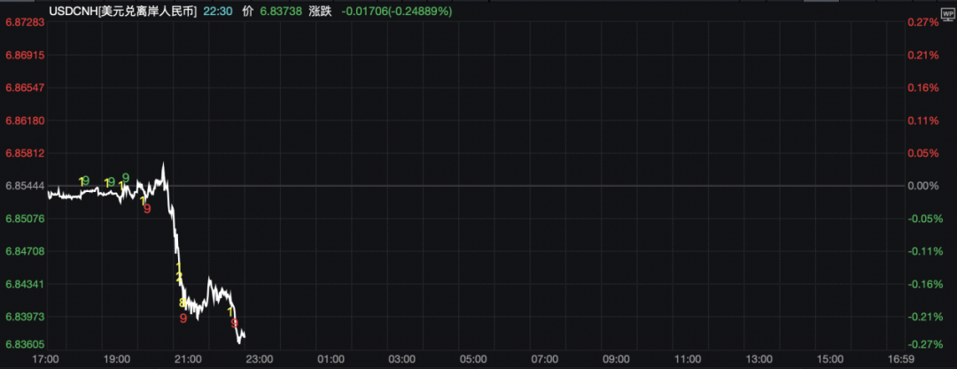 Wind数据显示,截至11:30,在岸人民币对美元汇率报6.8414元,较前收盘价上涨258个基点,盘中最高报6.8402元;离岸人民币对美元汇率报6.8374元,较前收盘价上涨171个基点,盘中最高报6.8361元。