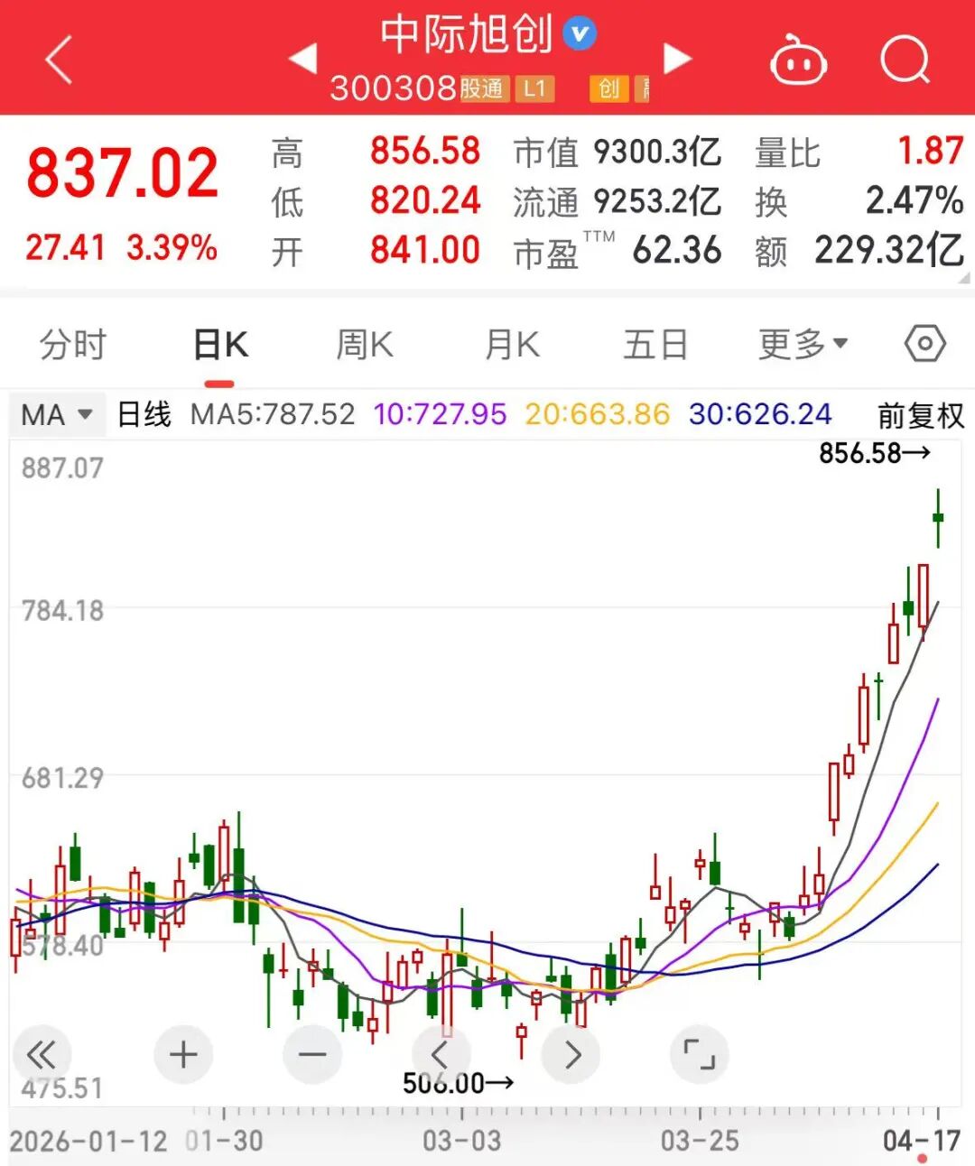中际旭创上午上涨3.39%,盘中一度涨近6%,股价创历史新高,最新市值为9300亿元。在万得A股排行榜上,中际旭创排在人气榜第一位,同时也是成交额第一名。算力产业链全面走强,光模块、光纤、PCB等板块涨幅居前。