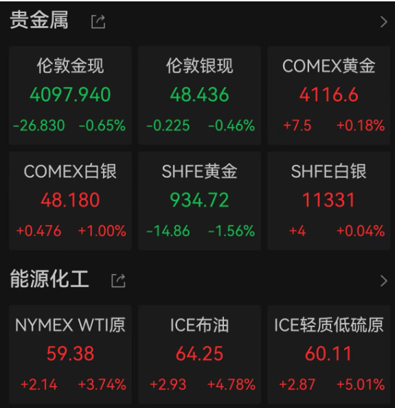 贵金属方面,截至收盘,伦敦现货黄金价格跌0.65%,报4097.94美元/盎司,伦敦现货白银价格跌0.46%;COMEX黄金期货涨0.18%,报4116.6美元/盎司,COMEX白银期货涨1%。
