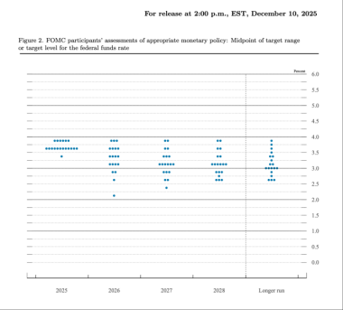 最新发布的点阵图预测显示,多数美联储官员预计在2026年和2027年各有一次25个基点的降息。美联储的中值预测显示,2026年利率为3.4%,2027年为3.1%,与9月份预测一致。有七位美联储官员预计,2026年不会降息,四位美联储官员预测数字显示在2026年有两次25个基点的降息。