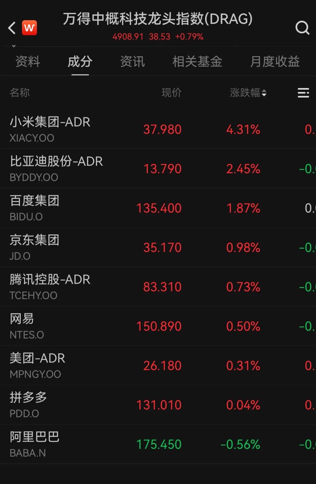 中概股逆势走强,纳斯达克中国金龙指数上涨0.42%,万得中概科技龙头指数上涨0.79%。其中,小米集团-ADR大涨4.31%,比亚迪股份-ADR涨2.45%,百度集团涨1.87%。大全新能源涨9%,世纪互联涨超7%,金山云涨超6%,蔚来、小鹏汽车涨超4%。