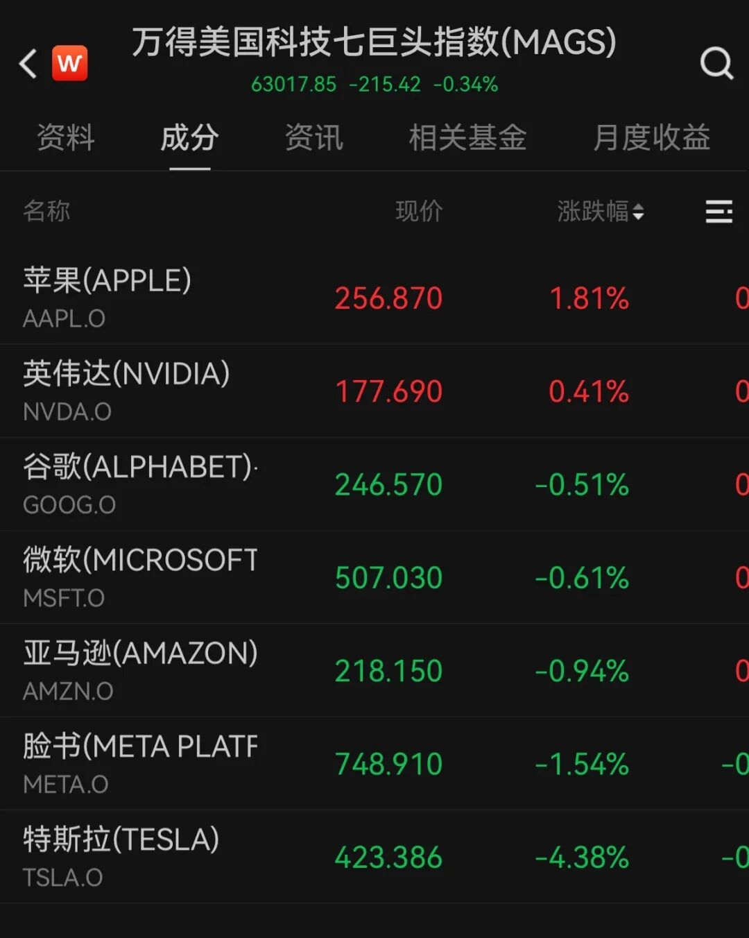 大型科技股收盘多数下跌,万得美国科技七巨头指数下跌0.34%。其中,特斯拉领跌超4%, Meta跌逾1%,亚马逊跌0.94%,微软跌0.61%,谷歌跌0.51%;苹果逆势上涨1.81%,英伟达涨0.41%。盘后,甲骨文股价一度涨逾2%。
