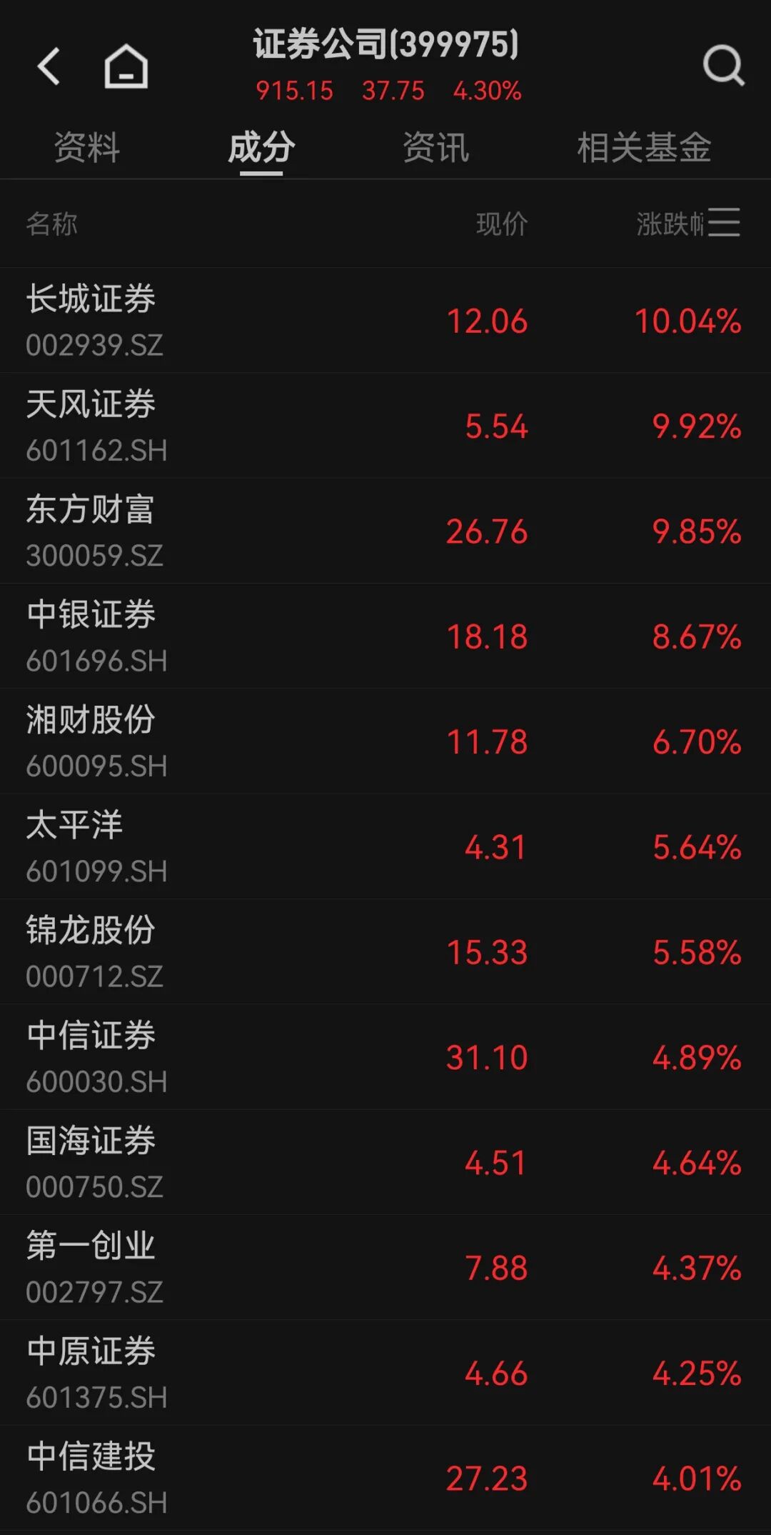 其中,东方财富全天成交额为442.12亿元,居A股第一;中信证券、同花顺、指南针全天成交额分别为123.14亿元、107.44亿元、106.9亿元。以上4家券商概念股成交额合计达779.6亿元。