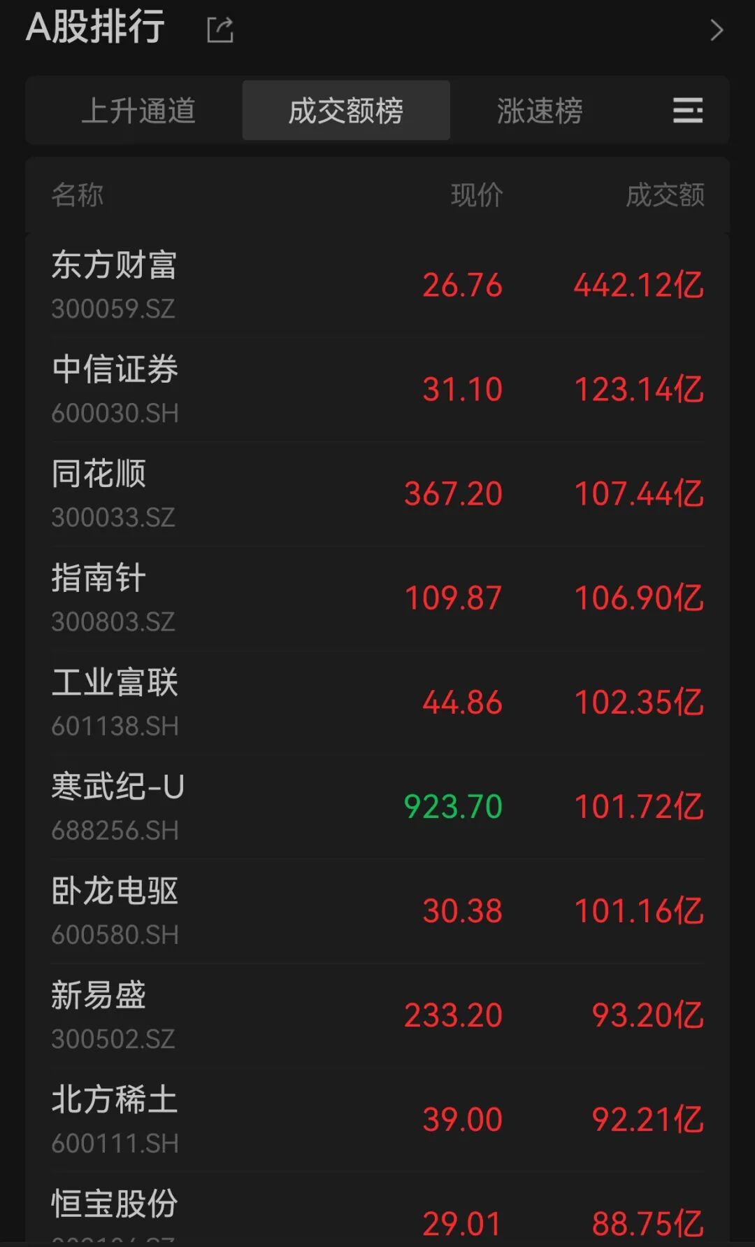 券商、金融科技股成交额包揽今天A股市场成交榜前四名。