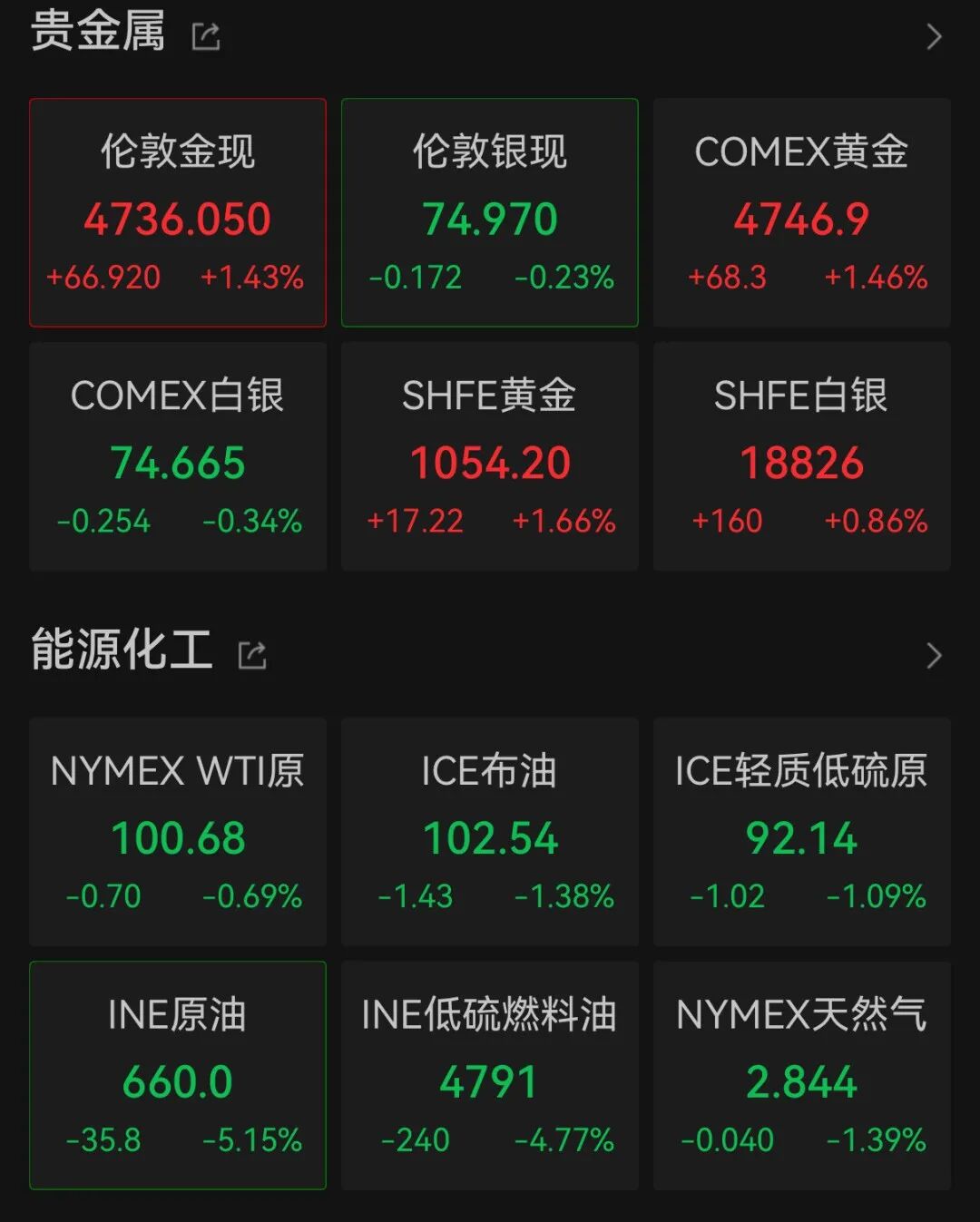 贵金属方面,黄金延续震荡上行态势,伦敦金现已连续4个交易日上涨,重回4700美元/盎司。截至北京时间4月1日21:16,伦敦金现上涨1.43%,报4736.050美元/盎司;COMEX黄金期货上涨1.46%,报4746.9美元/盎司。伦敦银现下跌0.23%,报74.970美元/盎司;COMEX白银期货下跌0.34%,报74.665美元/盎司。