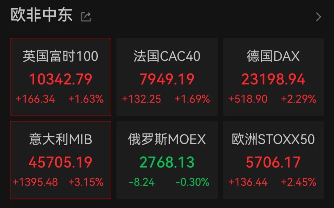 受全球风险偏好回暖、地缘局势缓和预期加持,欧洲股市多数上涨。Wind数据显示,截至北京时间4月1日21:16,英国富时100指数上涨1.63%,法国CAC40指数上涨1.69%,德国DAX指数上涨2.29%,意大利MIB指数上涨3.15%。