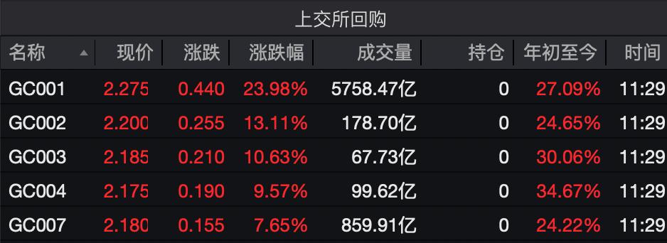 此外,Wind数据显示,截至12月30日11:30,深市1天期国债逆回购品种收益率上涨52个基点至2.29%,其他期限国债逆回购品种收益率也多有上涨。