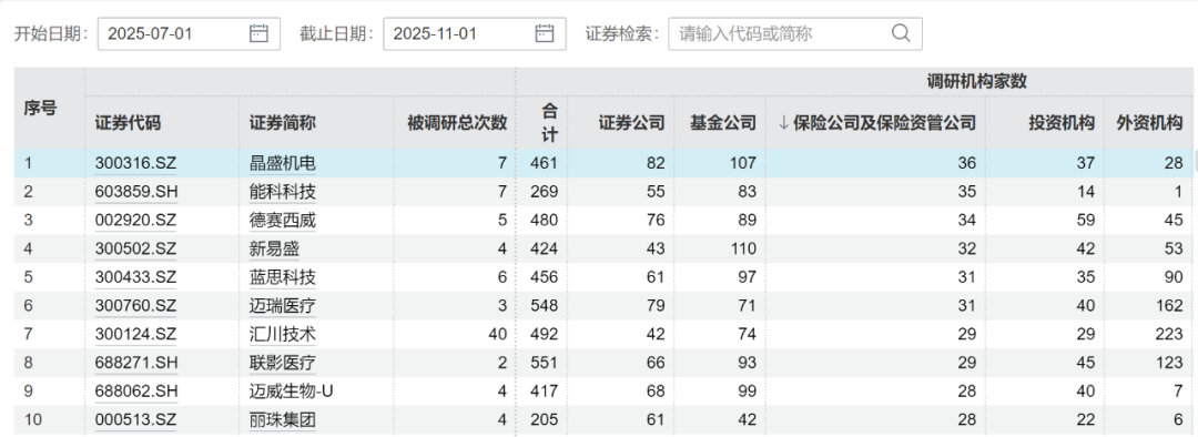 从被调研个股来看,晶盛机电、能科科技、德赛西威、新易盛、蓝思科技、迈瑞医疗今年下半年以来获超30家保险机构及保险资管机构调研。