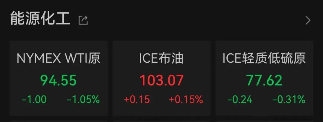 当前原油市场受地缘政策变动主导,供应端相关政策调整成为影响油价运行的核心因素。Wind数据显示,截至北京时间6:24,美油主力合约跌1.05%,报94.55美元/桶;布油主力合约涨0.15%,报103.07美元/桶。