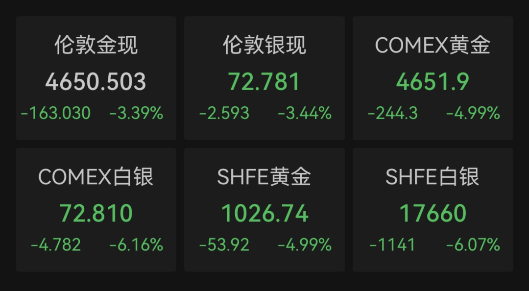 国际贵金属期货普遍收跌。Wind数据显示,COMEX黄金期货跌4.99%报4651.90美元/盎司,COMEX白银期货跌6.16%报72.81美元/盎司。