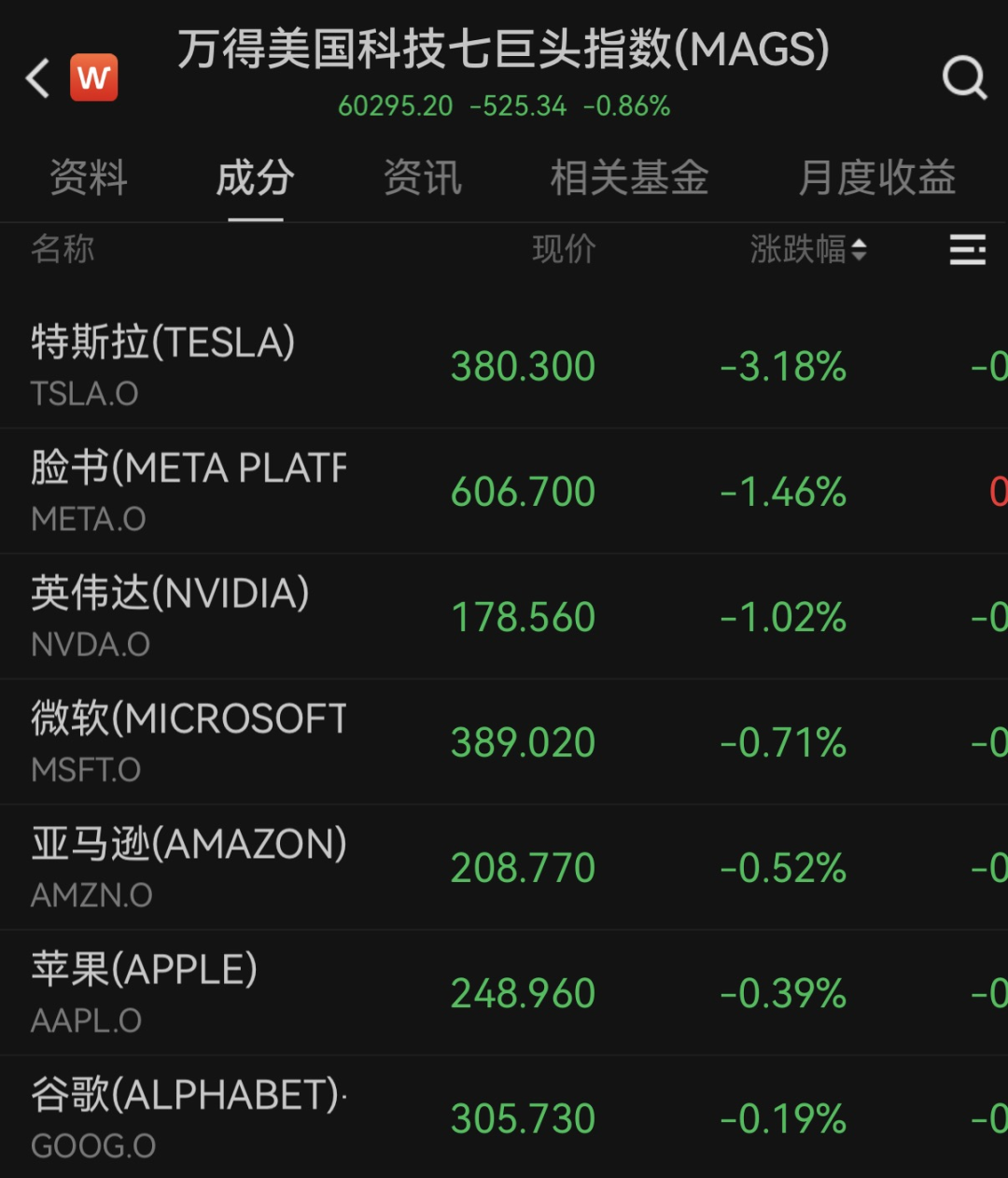 大型科技股集体下跌,万得美国科技七巨头指数下跌0.86%。个股方面,特斯拉跌超3%,META、英伟达跌逾1%,微软跌0.71%,亚马逊跌0.52%,苹果跌0.39%,谷歌-C跌0.19%。