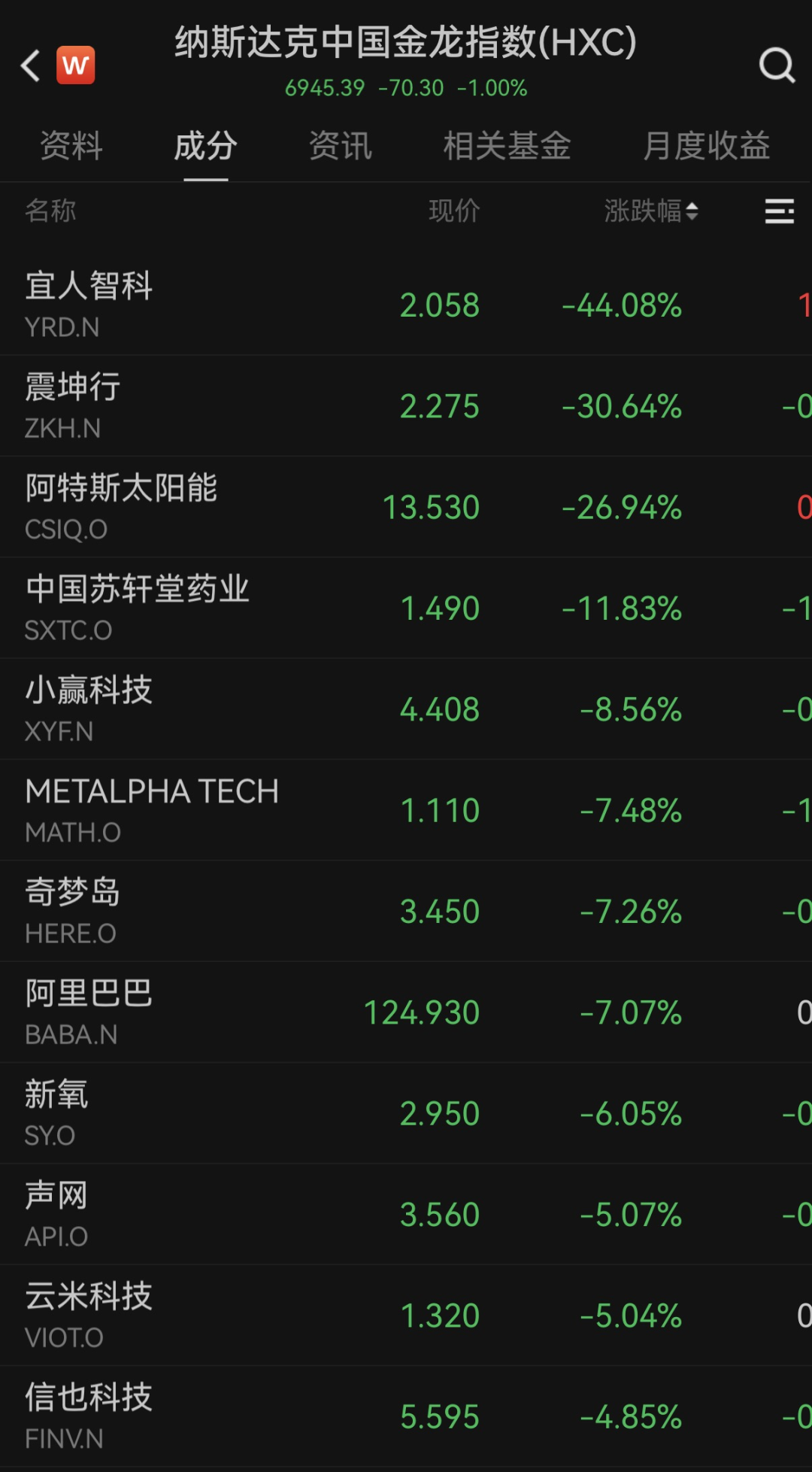 中概股多数下跌,纳斯达克中国金龙指数跌1%,万得中概科技龙头指数跌2.39%。个股方面,阿特斯太阳能跌近27%,阿里巴巴跌超7%,新氧跌超6%,大全新能源跌逾4%;亚朵涨超4%,小鹏汽车、满帮集团涨超2%。