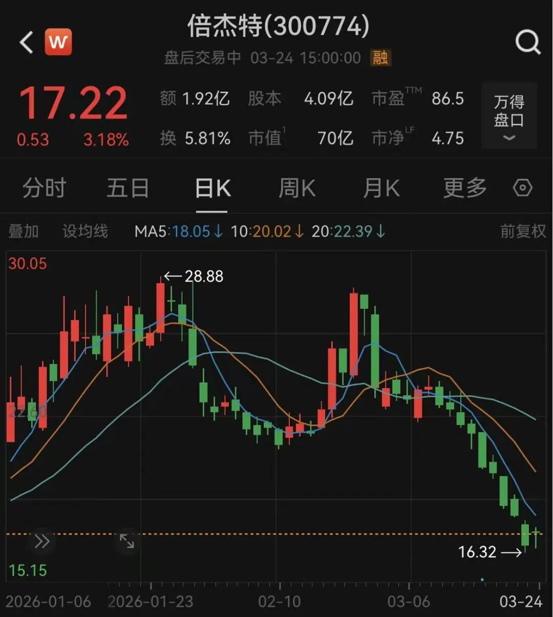 近期,倍杰特股价大幅回调。Wind数据显示,截至3月24日收盘,公司股价报17.22元/股,3月以来下跌38.7%。
