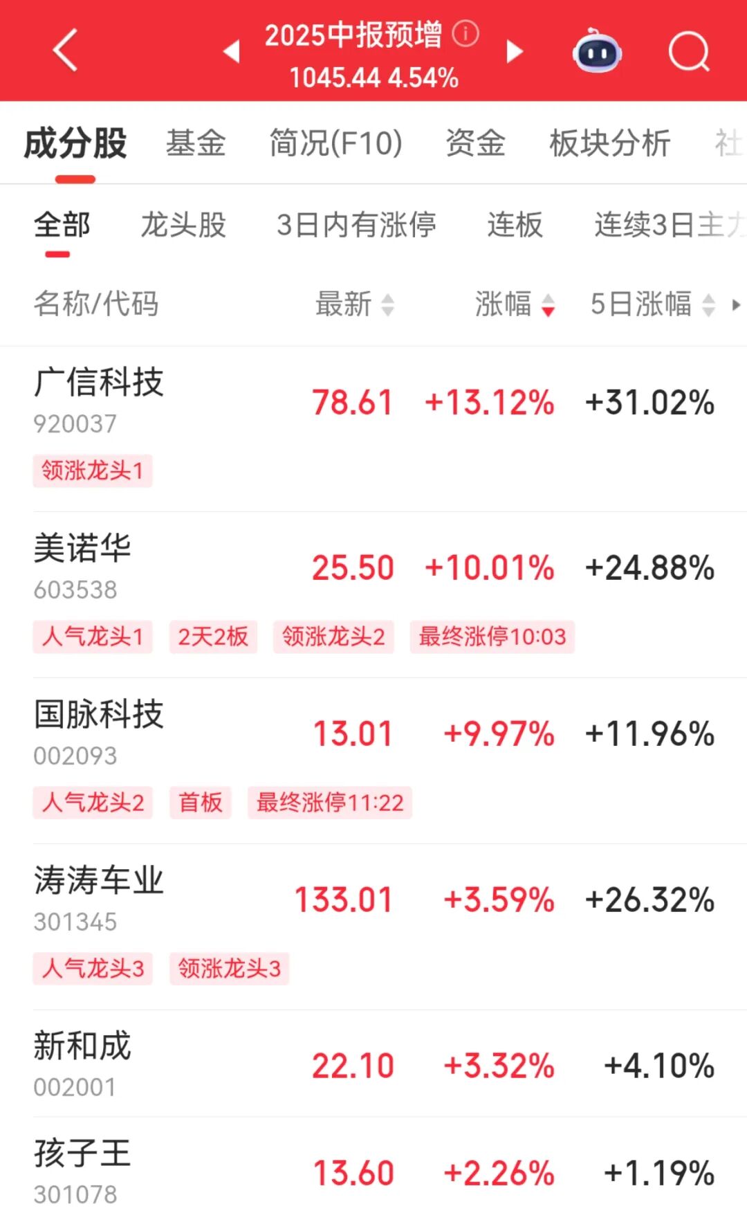 每年7—8月,A股中报行情都会成为市场关注焦点。2025年中报预增概念股中,美诺华、国脉科技今日涨停。