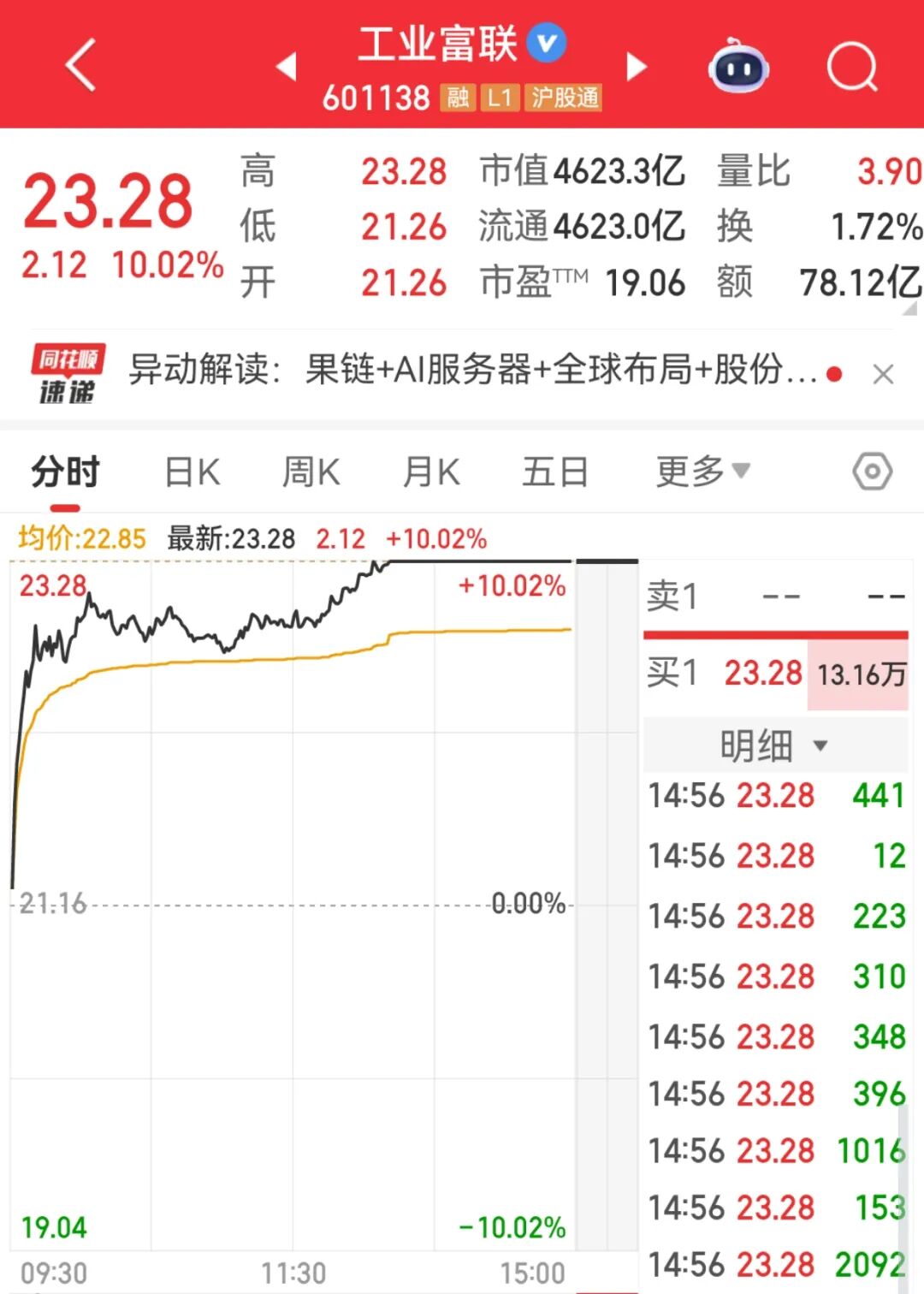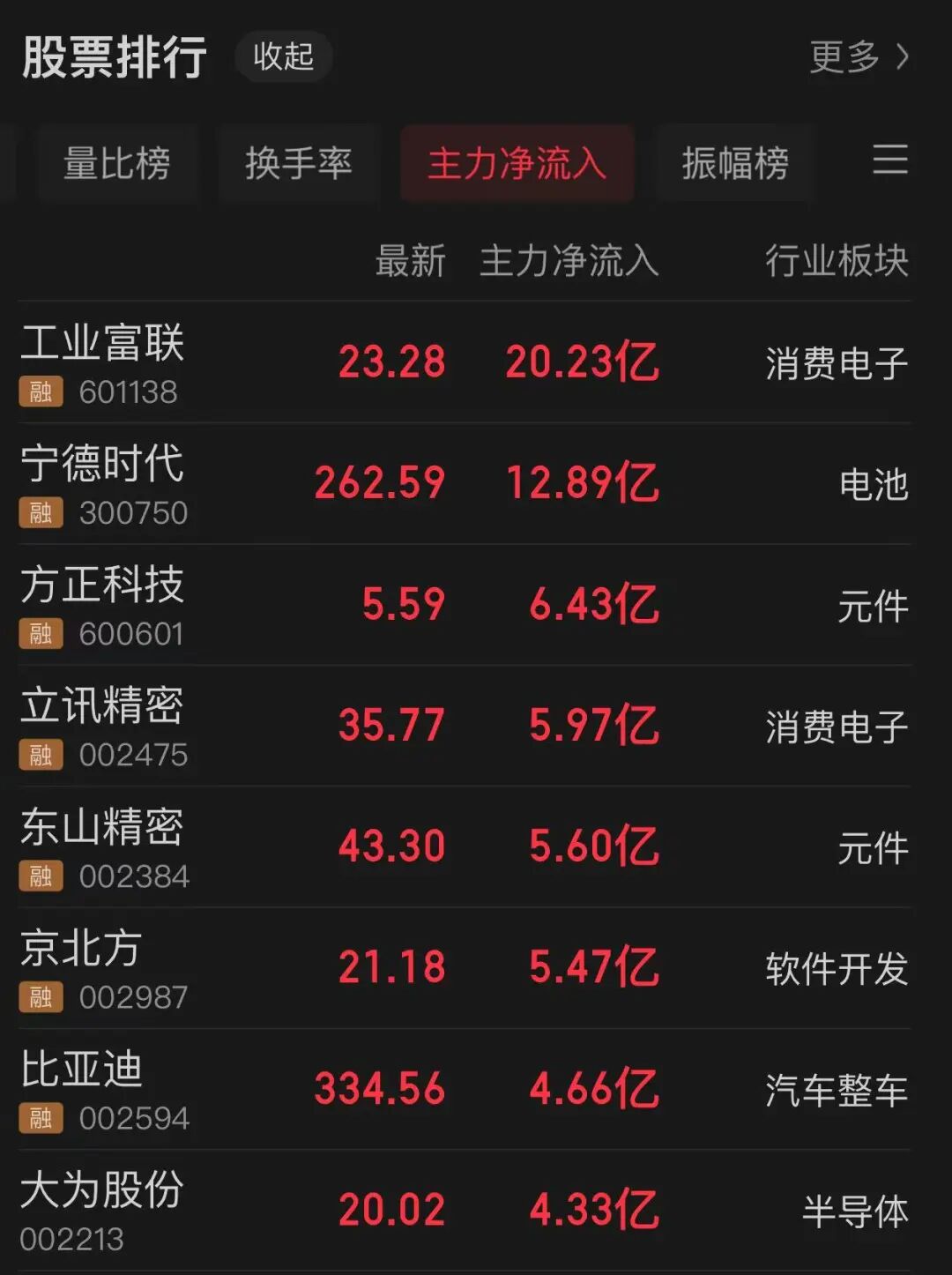 此外,同花顺数据显示,市值超4600亿元的工业富联(601138)午后涨停,主力资金净流入20.23亿元,居A股第一。