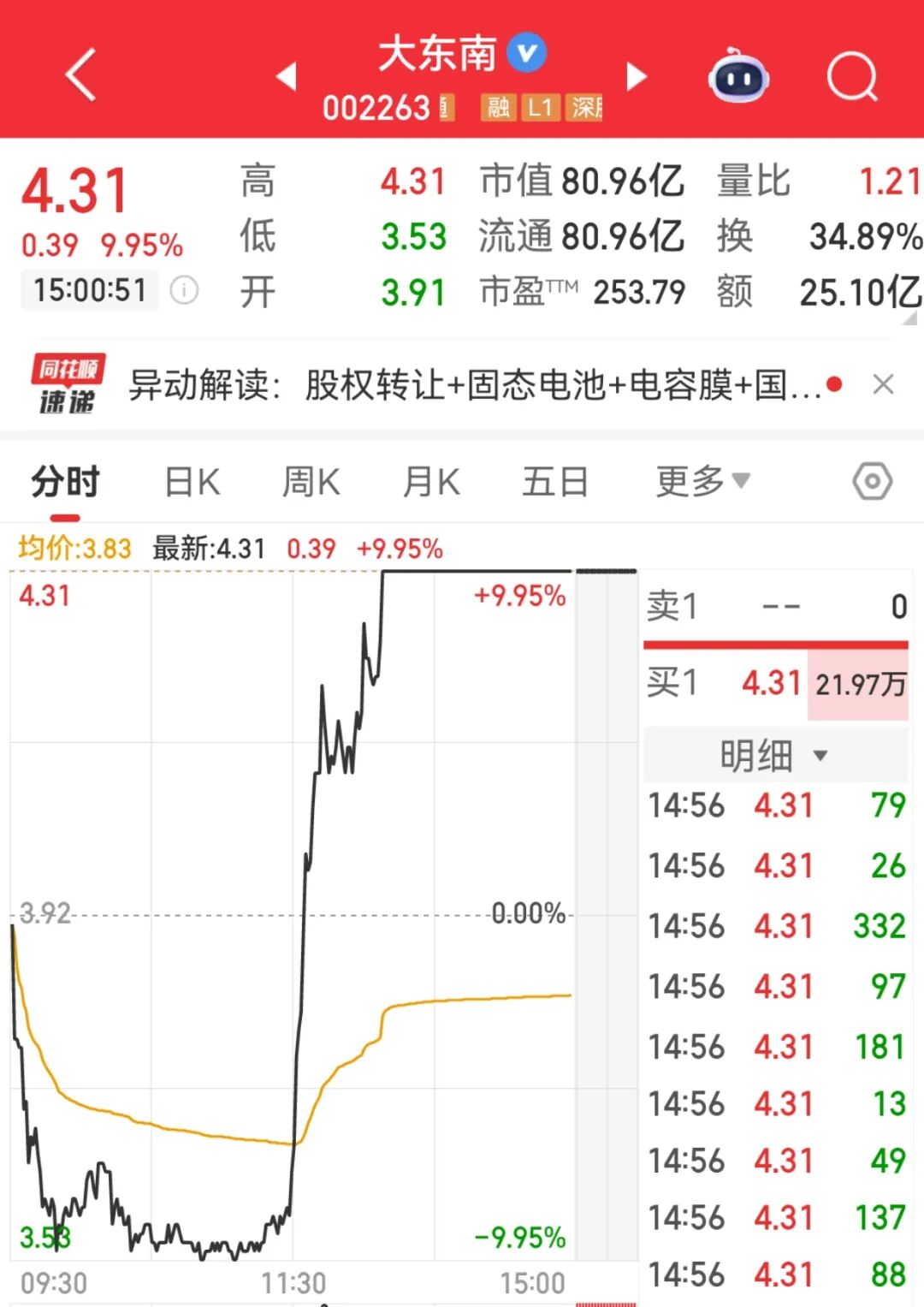 固态电池概念股今日探底回升,大东南(002263)上演“地天板”。