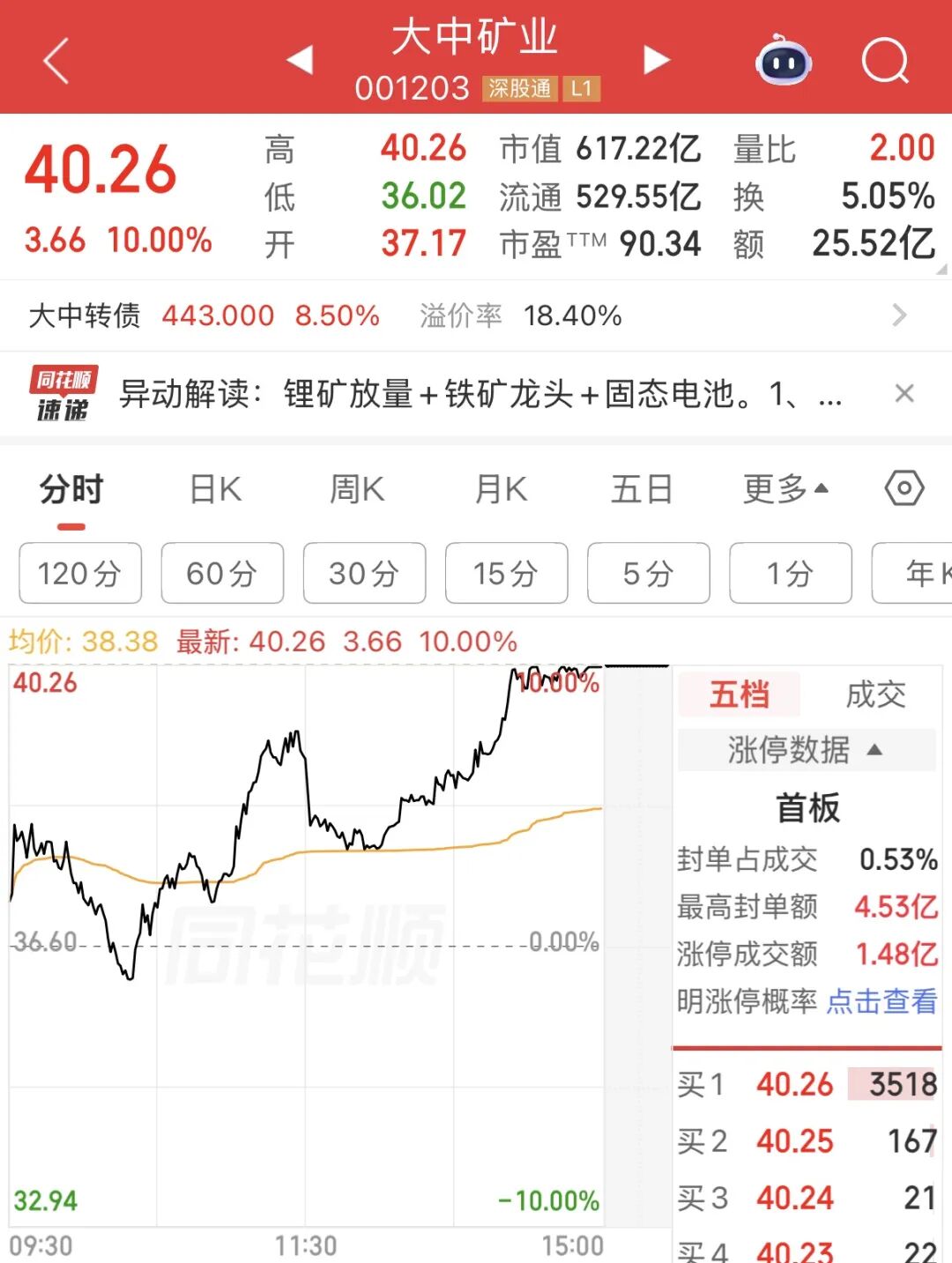 大中矿业尾盘涨停,收报40.26元/股,最新市值为617.22亿元。