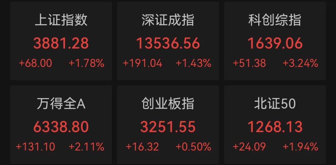 截至收盘,上证指数上涨1.78%,深证成指上涨1.43%,创业板指上涨0.5%,科创综指上涨3.24%。全市场超5100只个股上涨。