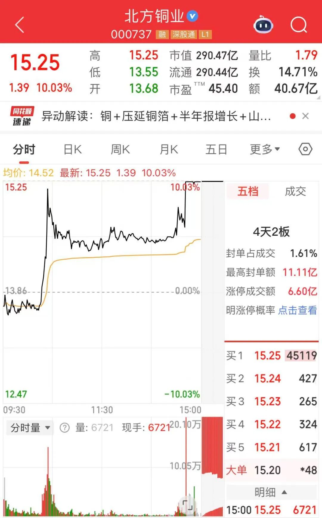 有色概念股尾盘上涨,14:41,北方铜业直线拉升,14:42涨停;云南铜业、中矿资源跟涨。北方铜业最新市值为290.5亿元,成交额为40.67亿元。