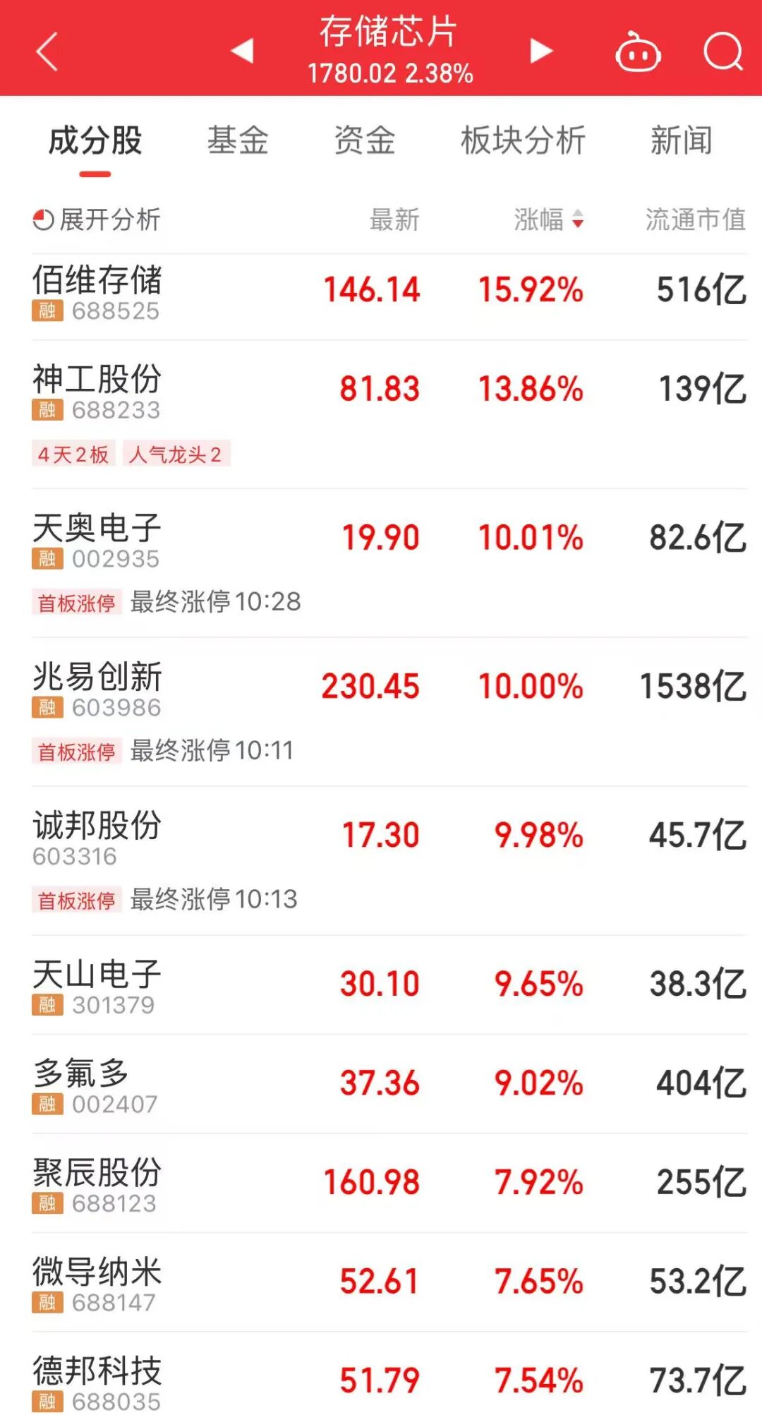 今天上午,半导体板块走强,存储芯片、国家大基金持股、第三代半导体等板块上涨。其中,存储芯片板块领涨,佰维存储、神工股份等个股大涨。