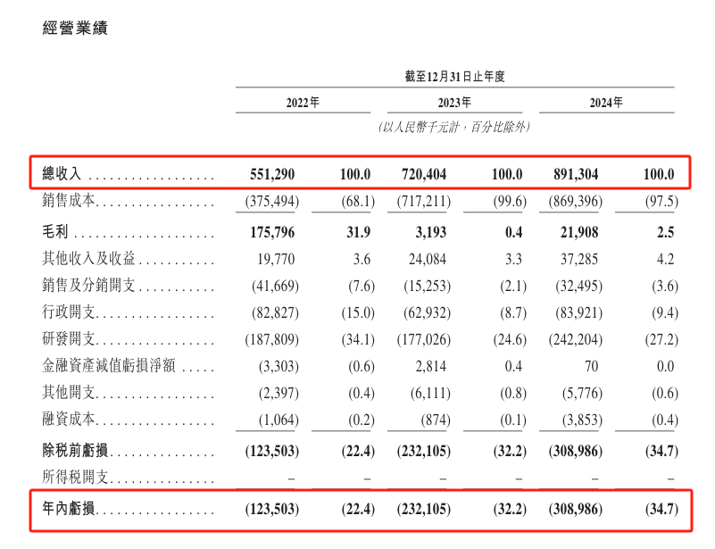 招股书显示,2022年至2024年,云英谷营业收入分别为5.51亿元、7.20亿元、8.91亿元,呈现持续增长势头。值得注意的是,相比营业收入的稳步增长,2022年至2024年,公司净亏损分别为1.24亿元、2.32亿元、3.09亿元,盈利状况呈持续下滑趋势。