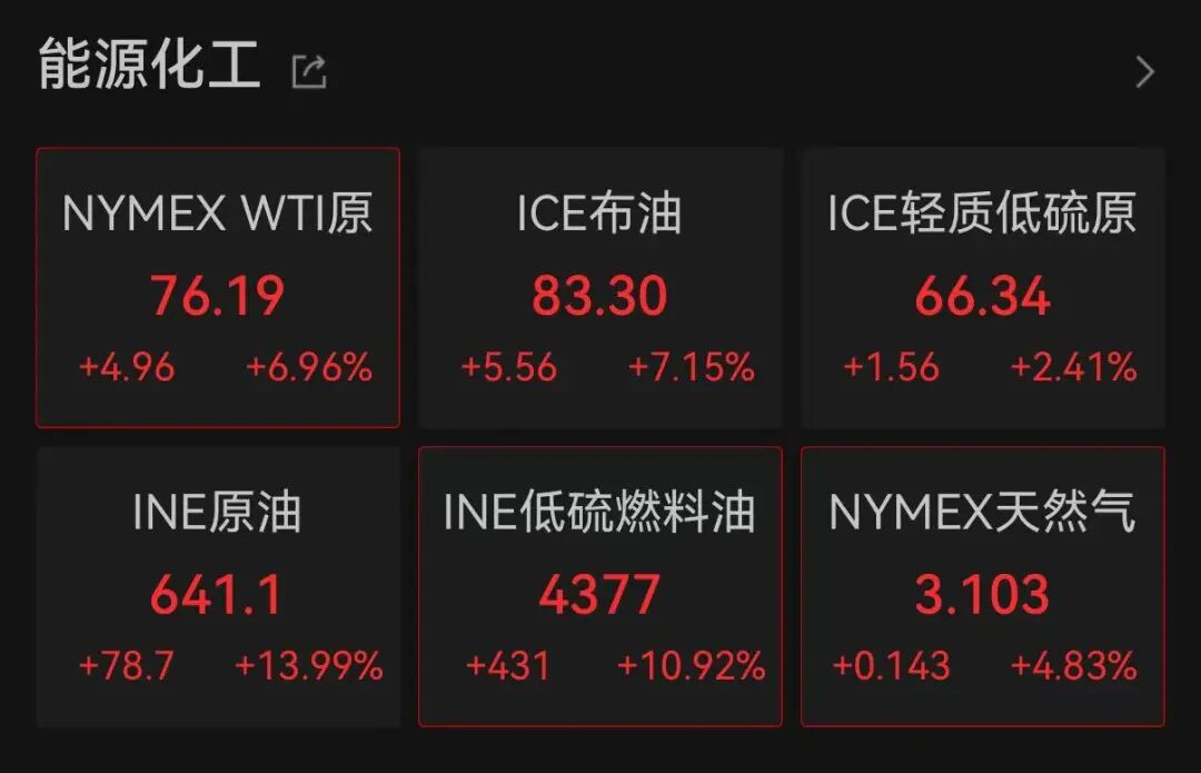 与贵金属普跌不同,布伦特原油日内一度涨超9%,截至北京时间21:40,报83.30美元/桶,涨幅达7.15%。