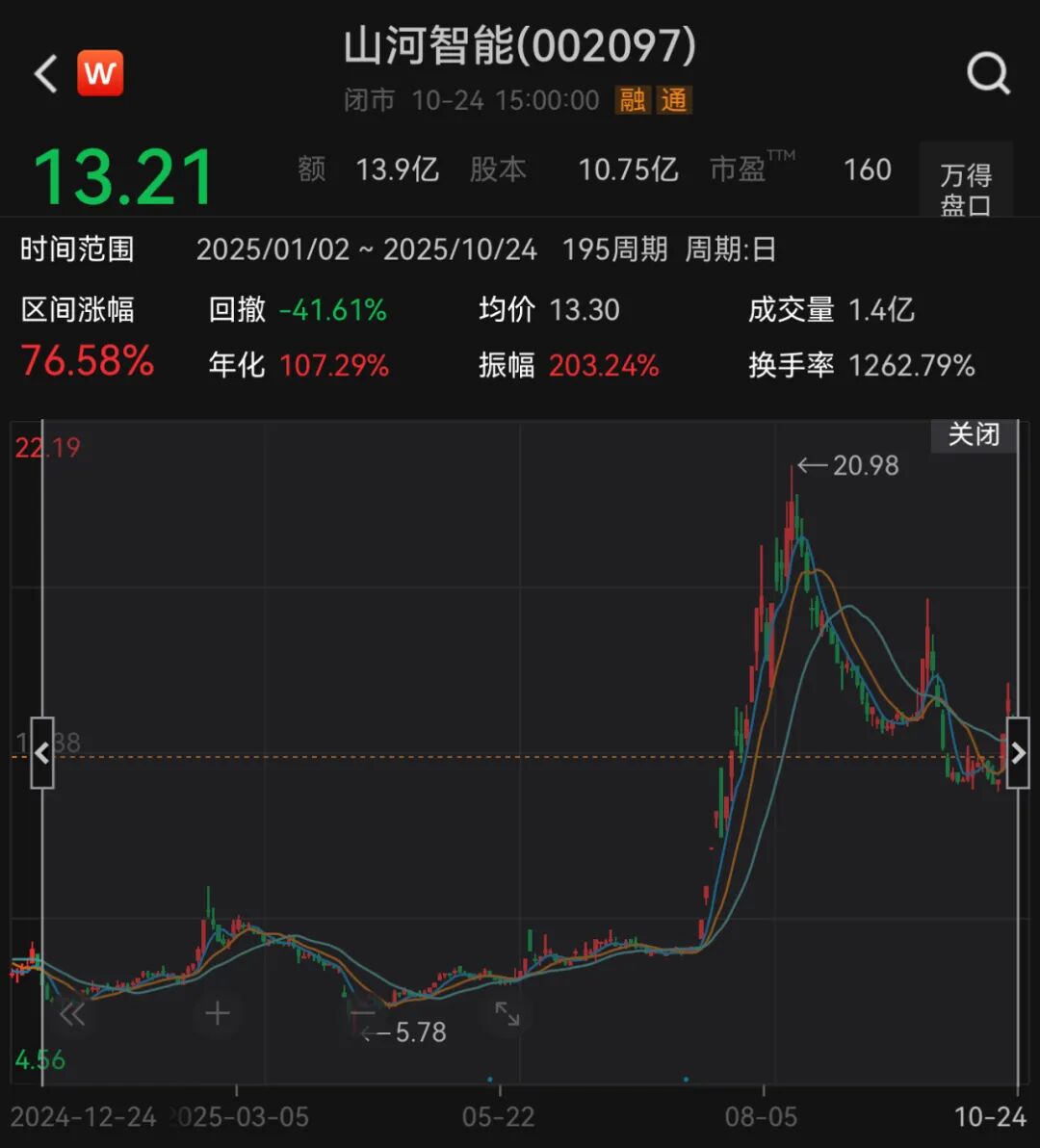 Wind数据显示,10月24日,山河智能收报13.21元/股,最新市值142亿元,今年以来,该股累计上涨超76%。
