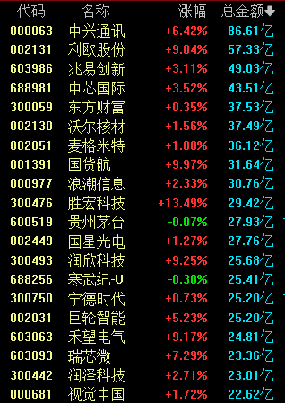 今天上午,科技股是市场主线,AI领涨,硬件端表现活跃,PCB板块大涨,掀起涨停潮。连续调整后,龙头股中兴通讯(000063)上午强势反弹,上涨6.42%,成交额为86.61亿元,重回A股成交额排行榜首位置。