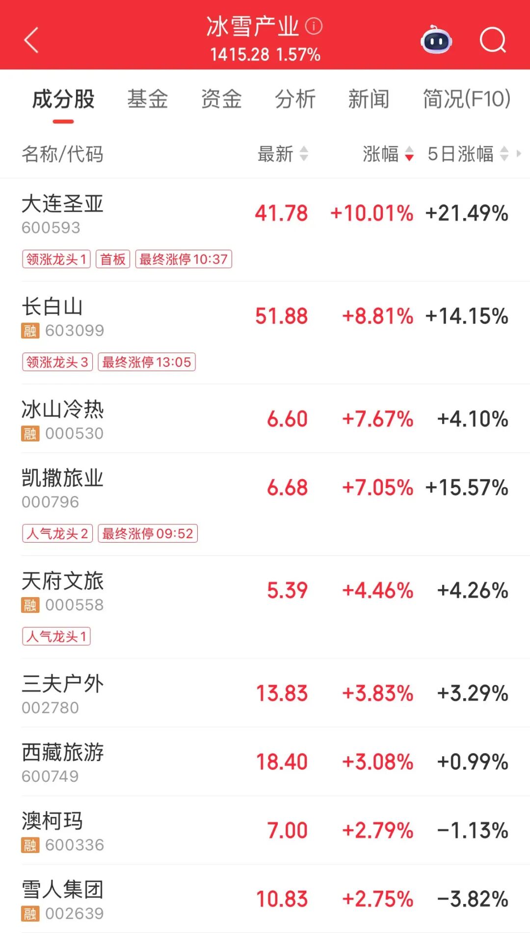 今天,冰雪产业板块走强。同花顺数据显示,截至收盘,大连圣亚涨停,长白山、冰山冷热涨幅居前。