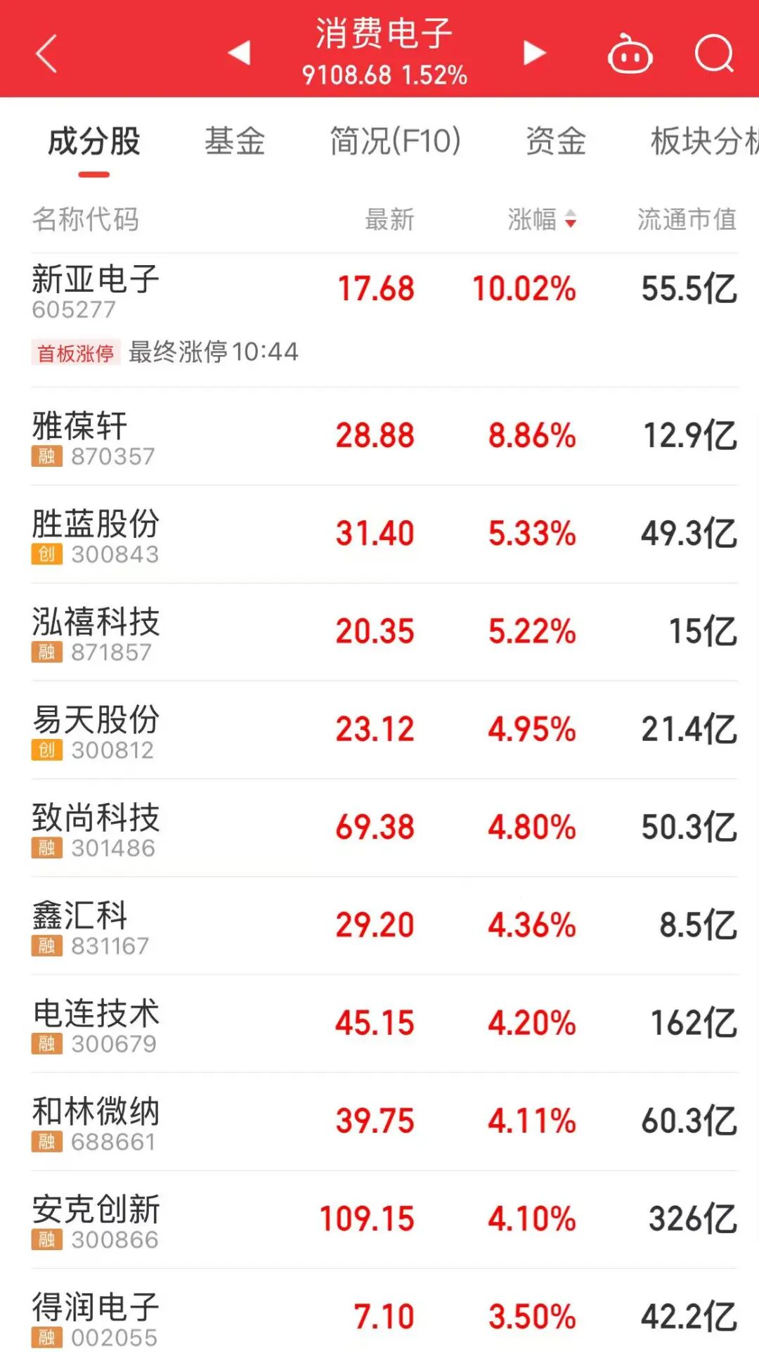 今天上午,消费电子概念表现活跃,AI手机、AI眼镜、AI PC等板块上涨,新亚电子、胜蓝股份等个股大涨。