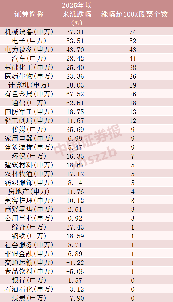 在446只涨幅超100%的股票中,来自机械设备、电子行业的股票最多,分别为74只、52只,来自电力设备、汽车、基础化工、医药生物行业的股票均超30只,来自计算机、有色金属行业的股票均超20只。这些牛股频出的行业板块,也是今年以来活跃的机器人、半导体、固态电池、DeepSeek等热门概念股集中的板块。