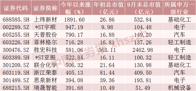 截至9月30日,今年以来涨幅最大的十只个股分别为上纬新材、*ST宇顺、天普股份、菲林格尔、胜宏科技、*ST亚振、联合化学、浙江荣泰、思泉新材、瑞晟智能,涨幅均超390%。