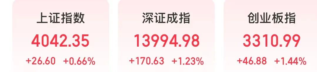A股三大指数早盘高开。截至9:37,上证指数上涨0.66%,深证成指上涨1.23%,创业板指上涨1.44%。