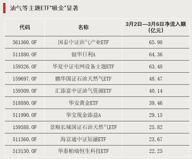 上周(3月2日—3月6日),油气、电网、黄金等主题ETF“吸金”显著。国泰中证油气产业ETF区间净流入额达65.98亿元,华夏中证电网设备主题ETF区间净流入额达63.48亿元,华安黄金ETF区间净流入额达39.46亿元。
