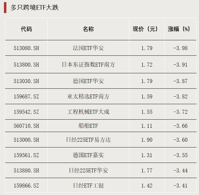 3月9日,多只跨境ETF明显调整,跟踪法国、日本、德国等市场的ETF跌超3%。此外,多只船舶、工程机械等主题ETF亦有明显震荡。